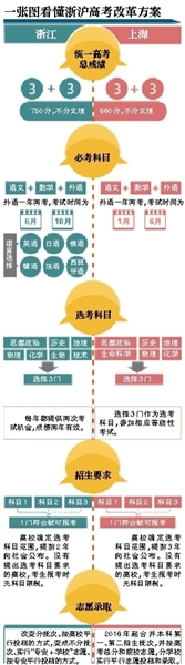 昨日,浙江和上海同时公布各自深化高校考试招生制度综合改革试点方案,从今秋入学的高一新生开始实施“新版高考”。按照国务院的要求,试点也要为其他省市区的高考改革提供依据。两地此次的改革方案不仅涉及统一高考,还包括高职招生等招考方式。根据方案,两地统一高考总成绩均由“3+3”组成,不分文理科,外语实行一年两次考试。