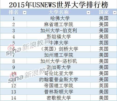一直以全美大学排名为金字招牌的USnews,在今晨联合汤森路透发布了2015年全球大学排行榜。在全球百名大学的榜单中,美国大学有50所入选,占据半壁江山。 高居榜首的是美国老牌名校哈佛大学,麻省理工学院位居次席。中国高校中有27所位列榜单前500名。中国内地高校中,北大清华跻身前100名,分别位列第39与第67。进入前两百的内地高校还有复旦、浙大、中科大、上海交大、南大。
