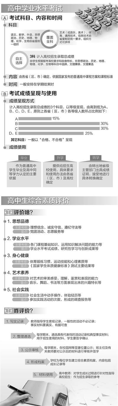 为贯彻落实《国务院关于深化考试招生制度改革的实施意见》,教育部16日发布了《关于普通高中学业水平考试的实施意见》《关于加强和改进普通高中学生综合素质评价的意见》。两个配套文件在多年实践的基础上完善高中学业水平考试,提高其权威性和公信力;规范高中学生综合素质评价,做到程序透明公开,内容真实可信。