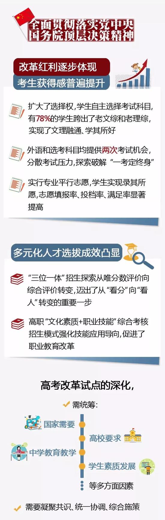 本轮高考综合改革,是1977年恢复高考以来规模最大、涉及面最广、任务最艰巨的一次。浙江高考综合改革试点已完成阶段性目标,经第三方评估取得成功,进一步深化改革,需要凝聚共识、综合施策。