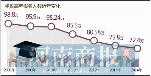 5月29日,2014年全省普通高校招生考试工作电视电话会议在郑州召开。今年,河南有72.4万人报名参加高考,比去年的75.8万人减少了3.4万人,至此,河南高考人数连续6年下降。另外,今年我省高考将更加严格,将实行现场监考与网上监考“双重监考”、“双重巡考”和考生身份人工核对与技术验证“双重审验”。