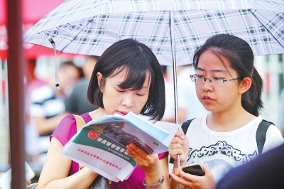 考生在家长的陪伴下精心地选择着自己中意的学校