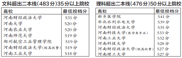 理科超出二本录取控制分数线(476)50分以上的有:新乡医学院(最低投档分541),华北水利水电大学(最低投档分539),河南财经政法大学(最低投档分535),河南科技大学(医学类专业,最低投档分533),河南工业大学(最低投档分532),河南科技大学(最低投档分528),河南财经政法大学(较高收费,最低投档分527),河南理工大学(最低投档分527)。
