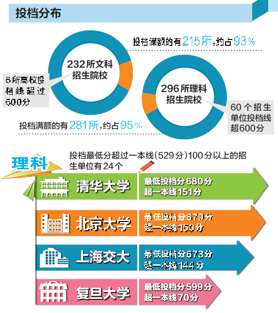 经过前两天的模拟投档,7月18日,河南高招本科一批的录取工作正式投档。今年我省本科一批计划招生52561人,投档53586份,平行志愿分布较均衡,文科约93%、理科约95%的院校满额。文科最低投档线在600分以上的有6所院校,理科最低投档线在600分以上的有60个招生单位。