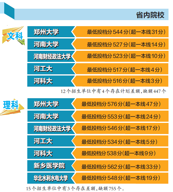 ★郑州大学 不包括中外合作办学,文科计划招生743人,投档773人,理科计划招生2804人,投档2889人。该校今年在河南一本计划占所有“211工程”重点高校在豫招生计划的22.4%,比往年提高了近4个百分点。