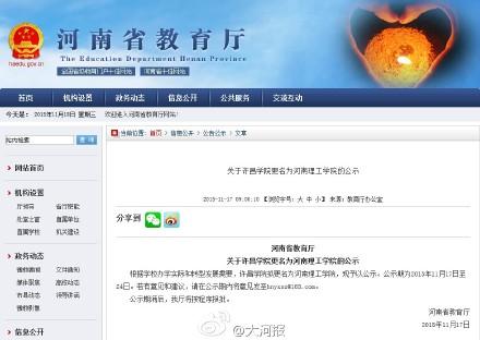 河南省教育厅发布的公示称,根据学校办学实际和转型发展需要,许昌学院拟更名为河南理工学院,现予以公示。公示期为2015年11月17日至24日。