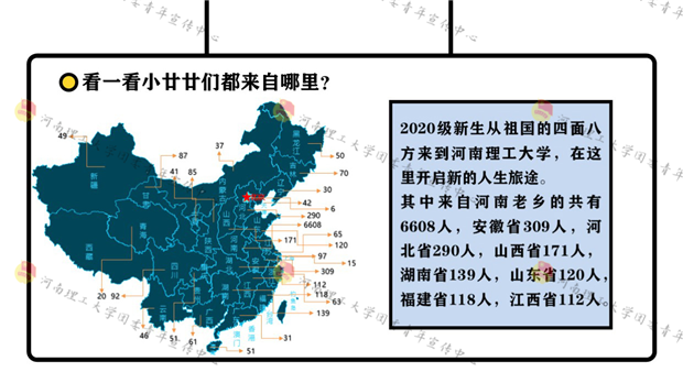 来自中国四端,横跨辽阔中国大地的我们在中原相遇,是命运的安排,也是缘分的相遇。“豫”见郑大,我们“20”(爱你)!