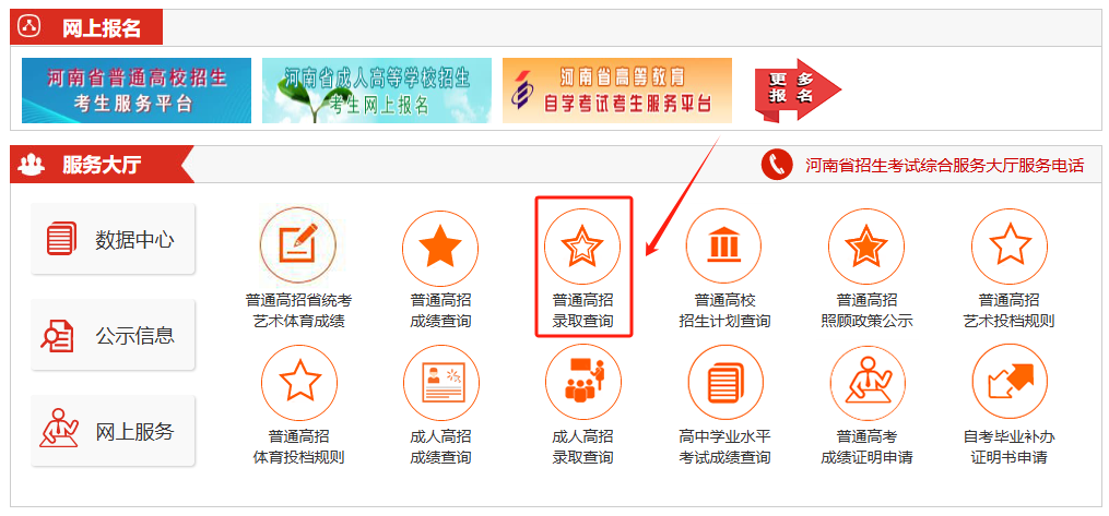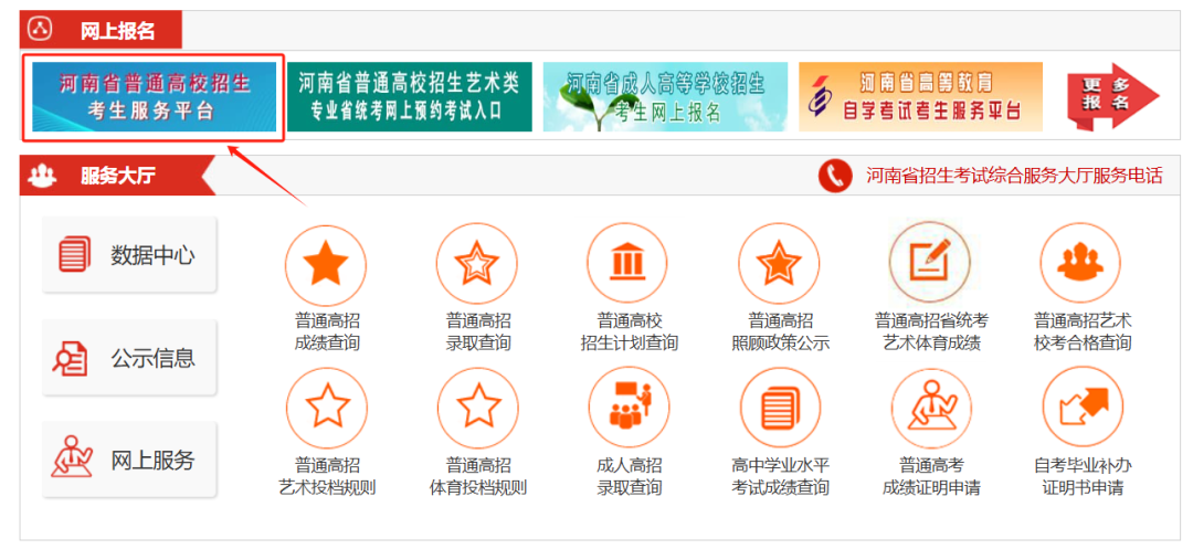 方法一:进入“河南省教育考试院网站(http://www.haeea.cn/)”,点击“河南省普通高校招生考生服务平台”进行查询。