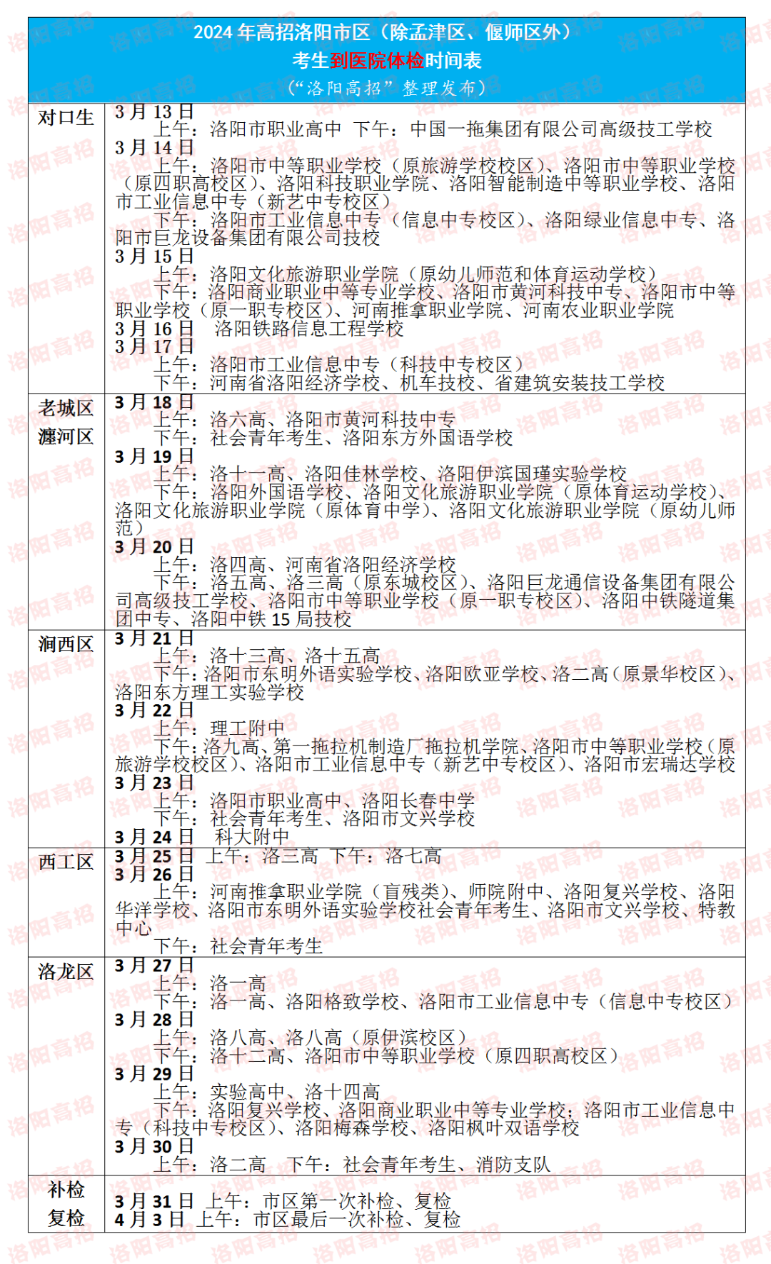 市区(除偃师、孟津外)社会青年考生体检时间为:老城区、瀍河区3月18日下午,涧西区3月23日下午,西工区3月26日下午,洛龙区3月30日下午;体检医院为河科大一附院开元院区。考生在体检当天上午8点到高考报名所在区考试服务中心抽血。(考试服务中心地址:涧西区,九都路与黄河路交叉口向北50米路西,电话0379-64880218;西工区,中州中路211号,电话0379-63261563;老城区、瀍河区,夹马营路75号,电话0379-63711776;洛龙区,龙门大道561号,电话0379-60696957)
