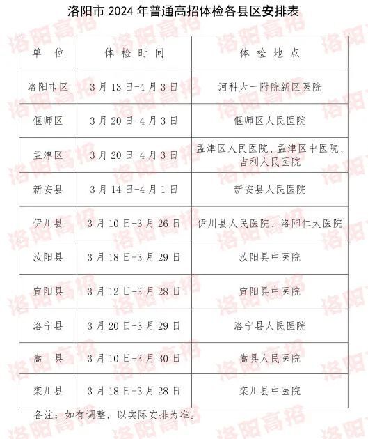 3月8日,洛阳市教育考试中心召开2024年普通高校招生体检工作视频会议。我市高招体检3月10日至4月3日进行,市区(除偃师、孟津外)考生将于3月13日至4月3日到河科大一附院开元院区参加体检。