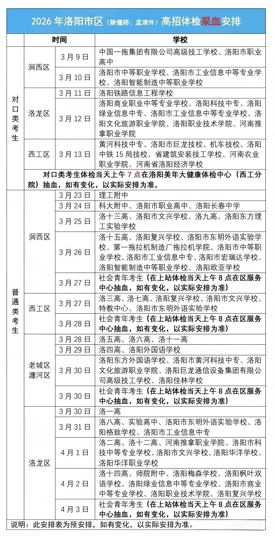 考生体检分为采血化验、到医院体检两步,市区(除偃师、孟津外)考生具体安排如下: