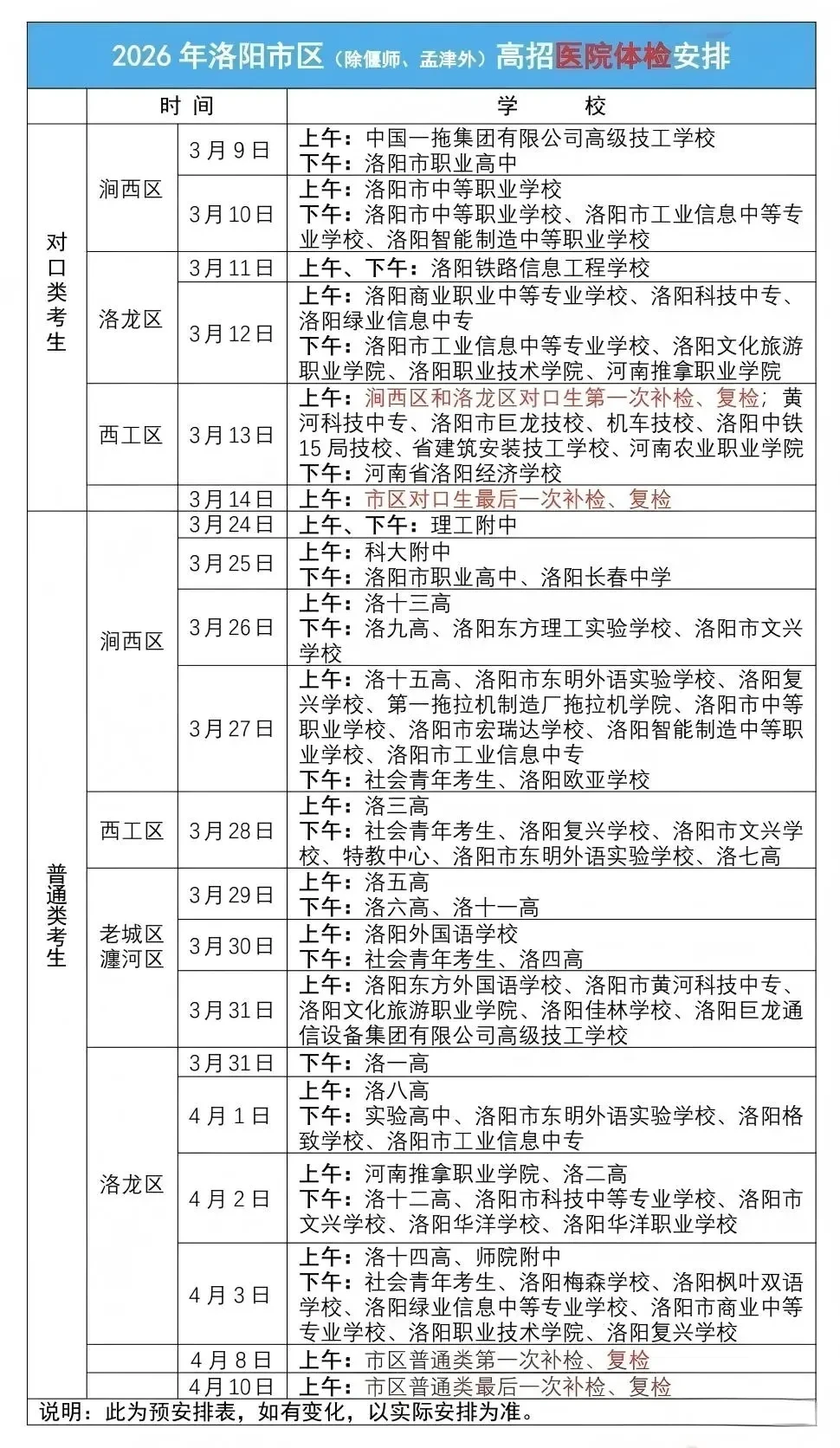 3月3日下午,市教育考试中心召开2026年普通高校招生体检工作会议,对高招体检进行安排,市区(除偃师、孟津外)考生将于3月9日至4月10日体检。
