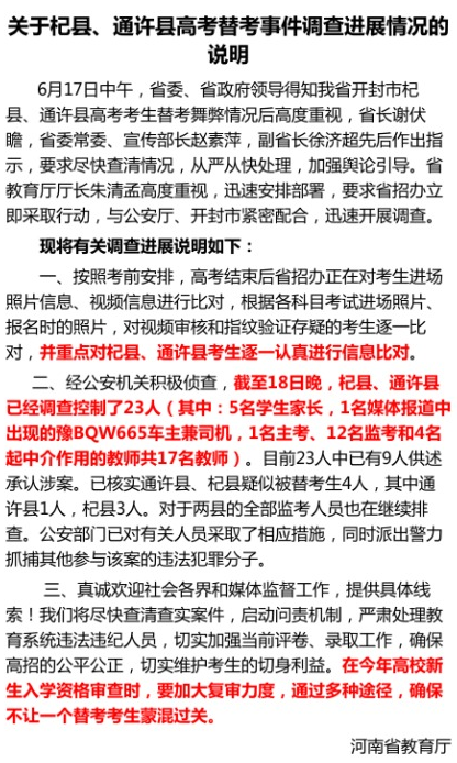 6月17日,省委、省政府领导得知我省出现高考替考事件后高度重视,有关领导先后作出重要指示,要求教育厅会同公安部门和当地政府认真调查,强调无论涉及到谁,决不姑息,必须依法依纪严肃处理。调查进展情况如下。
