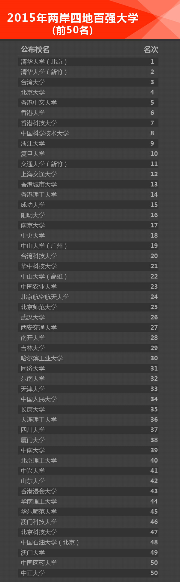 清华大学(北京)连续五次蝉联两岸四地大学排名榜首,清华大学(新竹)和台湾大学分获第二和第三名,前三名位次与2014年比没有变化。