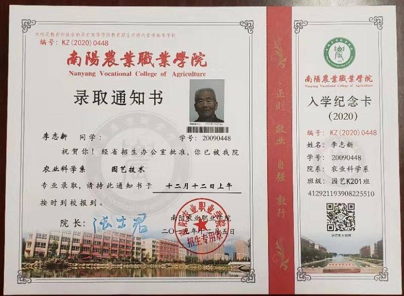“我们学院已经决定,正式录取南召县马市坪乡三官庙村81岁考生李志新和70岁考生孟庆立为我们今年的新生,录取手续已经办理完毕,通知书很快就会派专人送到他们手上。”12月4日下午,南阳农业职业学院院长张士君在电话里告诉记者。