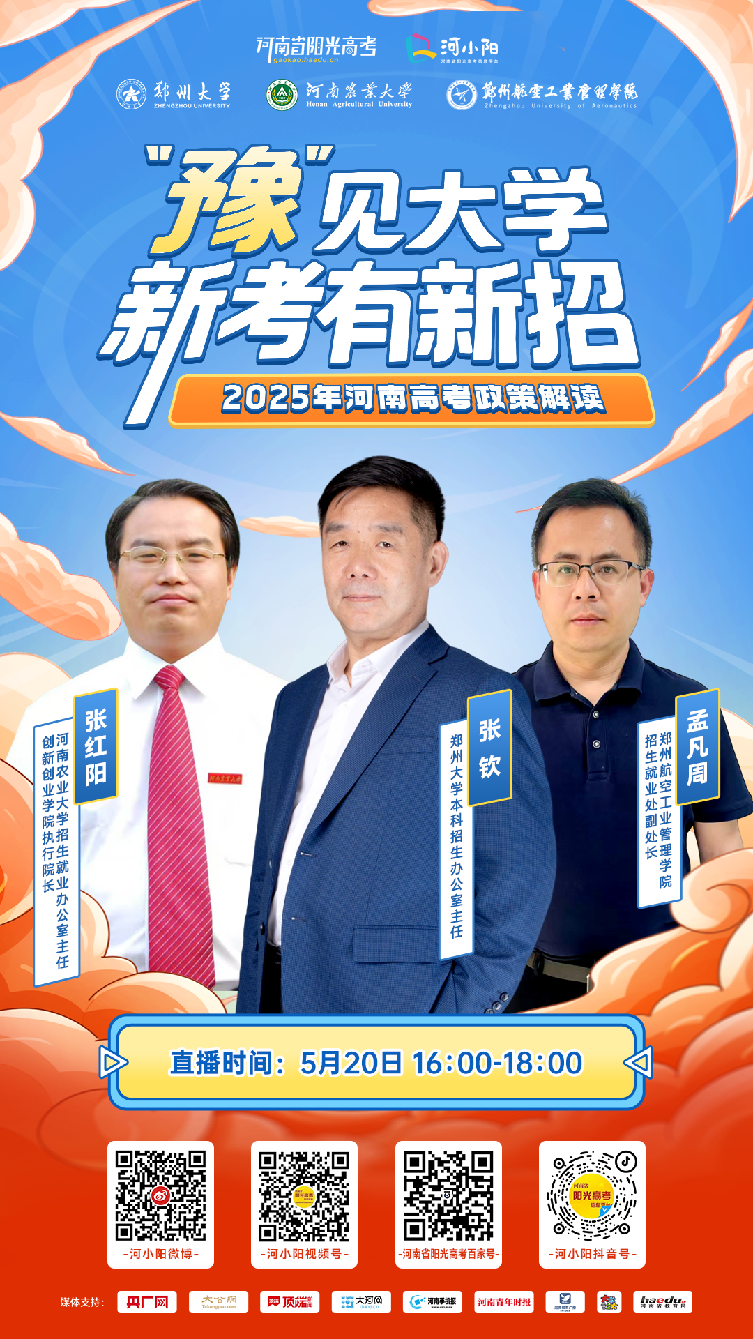 别愁!河南省阳光高考精心筹备的“豫”见大学——新考有新招专题直播5月20日闪亮登场!众多高校招生界大拿亮相直播间,为你深度拆解新高考政策,奉上一手招生情报,助你精准锚定理想高校!想知道5月20日有哪些精彩内容?往下瞧!