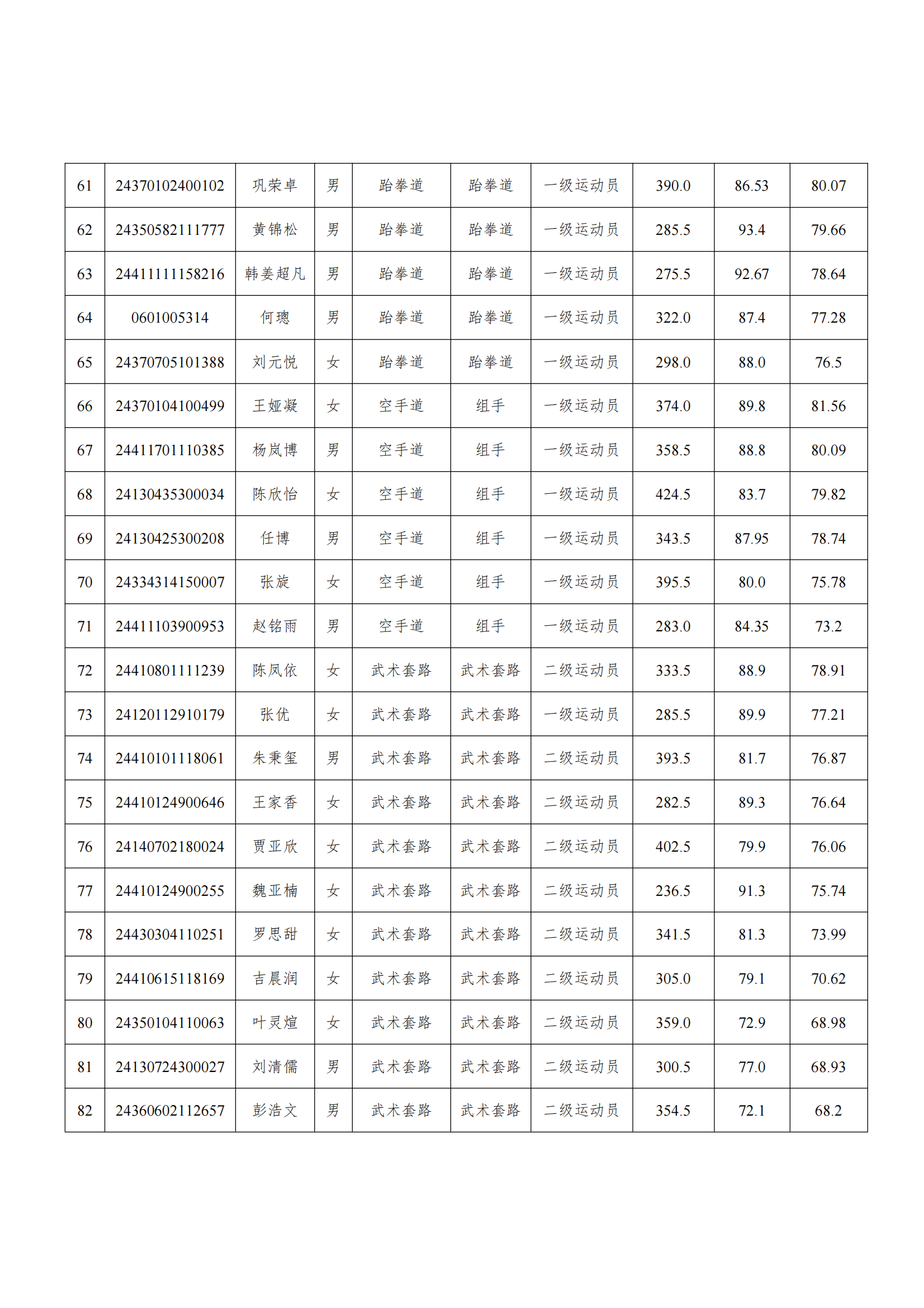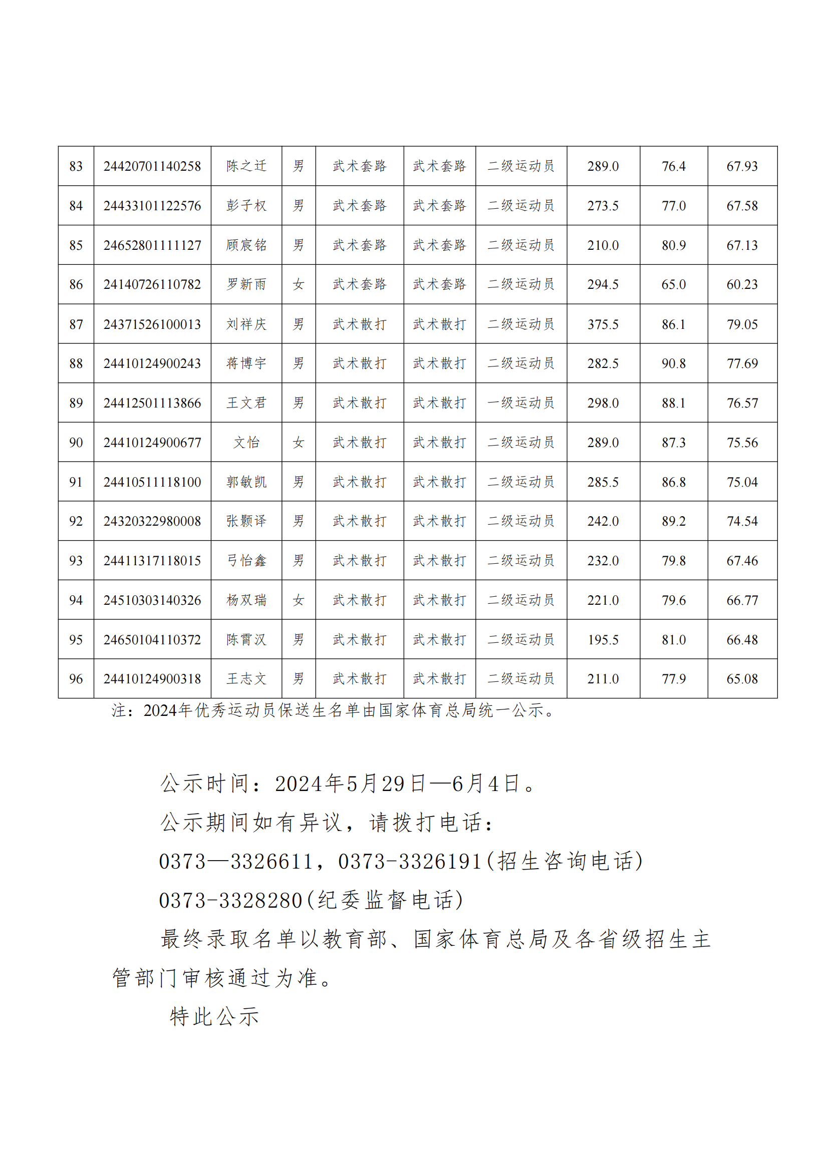 河南师范大学2024年运动训练、武术与民族传统体育专业单独招生拟录取考生名单公示