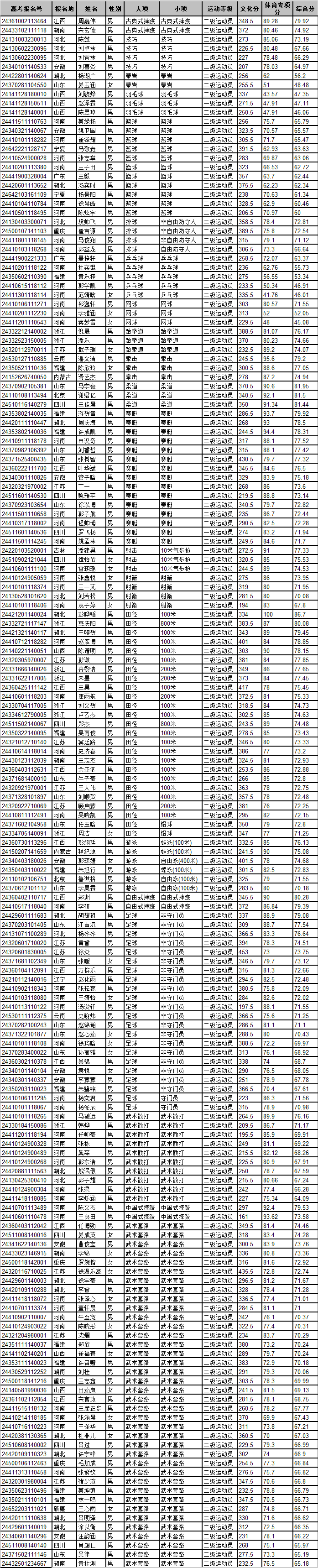 根据国家体育总局办公厅、教育部办公厅《关于印发<2024年普通高等学校运动训练、武术与民族传统体育专业招生管理办法>的通知》(体科字〔2023〕188号)要求,经学校招生领导小组研究决定,现将我校2024年运动训练、武术与民族传统体育专业拟录取结果公示如下: