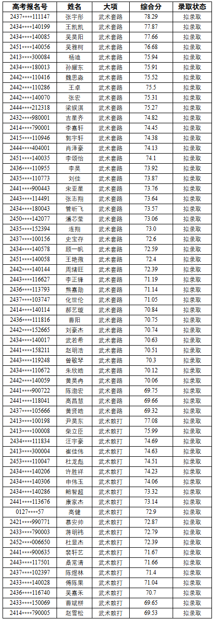 为做好2024年武术与民族传统体育专业招生工作,选拔符合培养要求的考试,确保招生工作公平公正、安全有序。根据国家教育部科学生司、体育总局科教司联合印发《2024年普通高等学校运动训练、武术与民族传统体育专业招生管理办法》的通知要求,以及学校公布的《商丘师范学院2024年武术与民族传统体育专业招生章程》相关规定。现将我校2024年武术与民族传统体育拟录取名单进行公示如下。