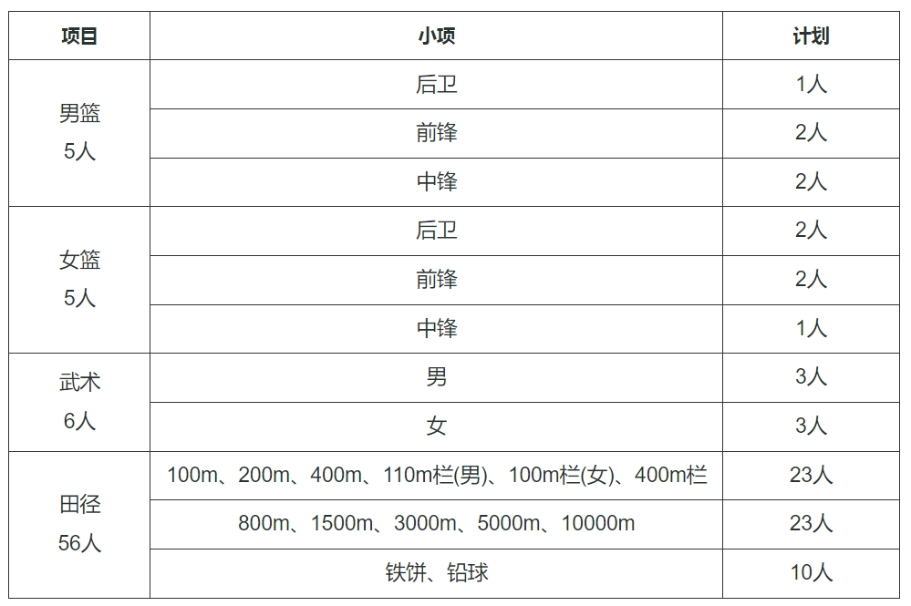 田径、篮球、武术(套路),共计招收72人。其中,田径限以下小项:100米、200米、400米、800米、1500米、3000米、5000米、10000米、110米栏(男)、100米栏(女)、400米栏、铁饼、铅球。