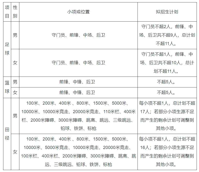田径项目若按上述规则和每个小项不超1人原则划定入围名单后仍然剩余名额,则将剩余合格考生再按测试分数从高到低排序,依次继续按每小项不超1人划定入围名单。田径项目不同小项同分情况下,按照高水平运动队建队需要按以下顺序,排在前面小项的考生优先排名:铅球,标枪,铁饼,跳高,三级跳远,跳远,10000米,5000米,3000米障碍,2000米障碍,1500米,800米,20000米竞走,10000米竞走,5000米竞走,110米栏,100米栏,400米栏,100米,200米,400米。