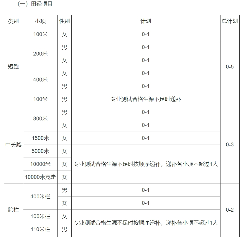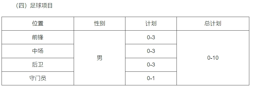 学校田径、网球、游泳、男子足球(十一人制)项目面向全国招生,总计划不超过51名。各项目具体需求及招生计划如下表所示。