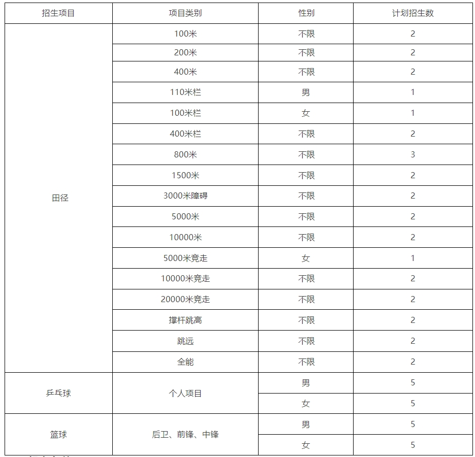 乒乓球项目:不招收曾参加过中国乒乓球俱乐部超级联赛、中国乒乓球甲A联赛、全国青年乒乓球锦标赛、全国乒乓球锦标赛的运动员,以及参加过其他国家和地区职业俱乐部职业比赛的运动员。
