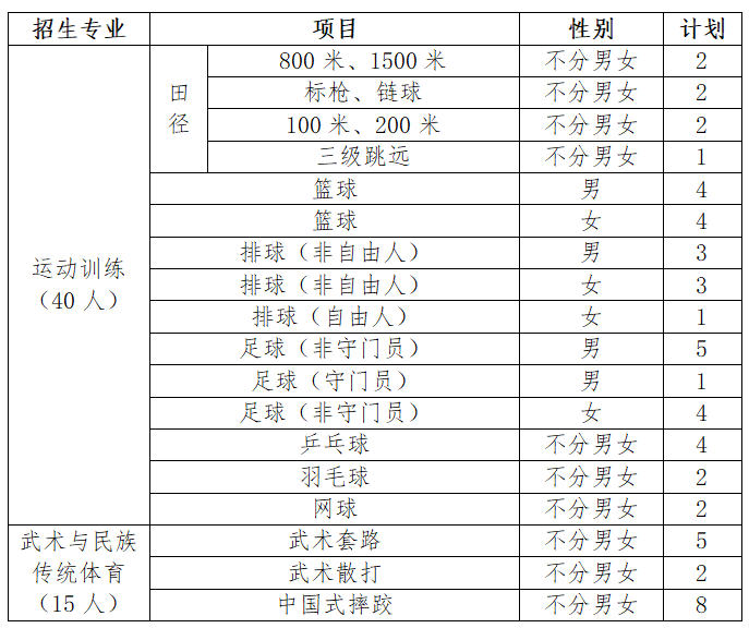 1.运动训练、武术与民族传统体育专业实行单独招生,经相关省(市、区)教育招生考试中心审核后提前录取,报国家体育总局核查备案后在学校网站进行公布。
