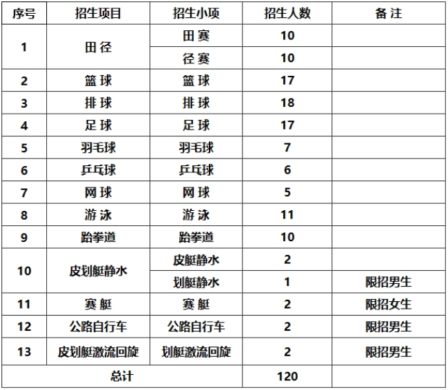 (三)招生项目:田径(100米、200米、400米、800米、1500米、男子5000米、女子100米栏、400米栏、跳高、跳远、三级跳远、标枪、铁饼、铅球)、篮球、排球、足球(十一人制)、羽毛球、游泳、乒乓球、跆拳道、网球、皮划艇静水、皮划艇激流回旋、赛艇、公路自行车等十三个大项。其中皮划艇静水、皮划艇激流回旋、赛艇、公路自行车四个项目仅招收一级以上(含一级)运动员。