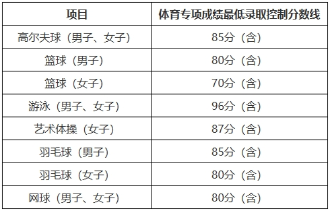 拟录取考生的体育专项考试成绩须达到我校规定的各项目体育专项成绩最低录取控制分数线及以上(计算时保留小数点后两位,采用四舍五入计数保留法)。
