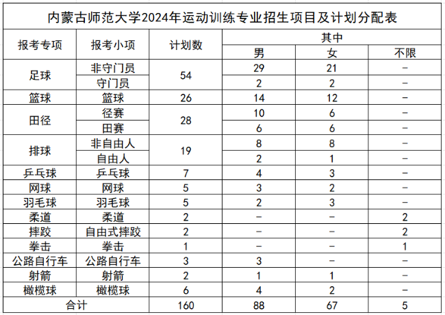 2024年运动训练专业面向全国招生160人,招生计划纳入内蒙古师范大学年度本科招生计划总规模,具体项目及计划数见下表: