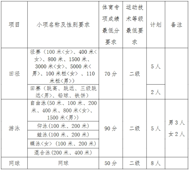 4.考生依据所获得的运动员技术等级证书的项目进行体育专项考试,招生计划中所列项目之间不得跨项参加考试。