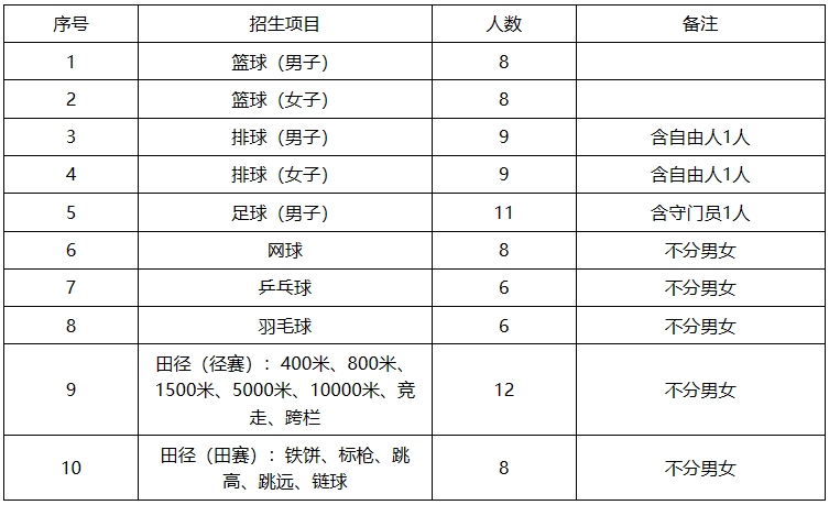 (一)招生项目:篮球、排球、男子足球(十一人制)、网球、乒乓球、羽毛球、田径。