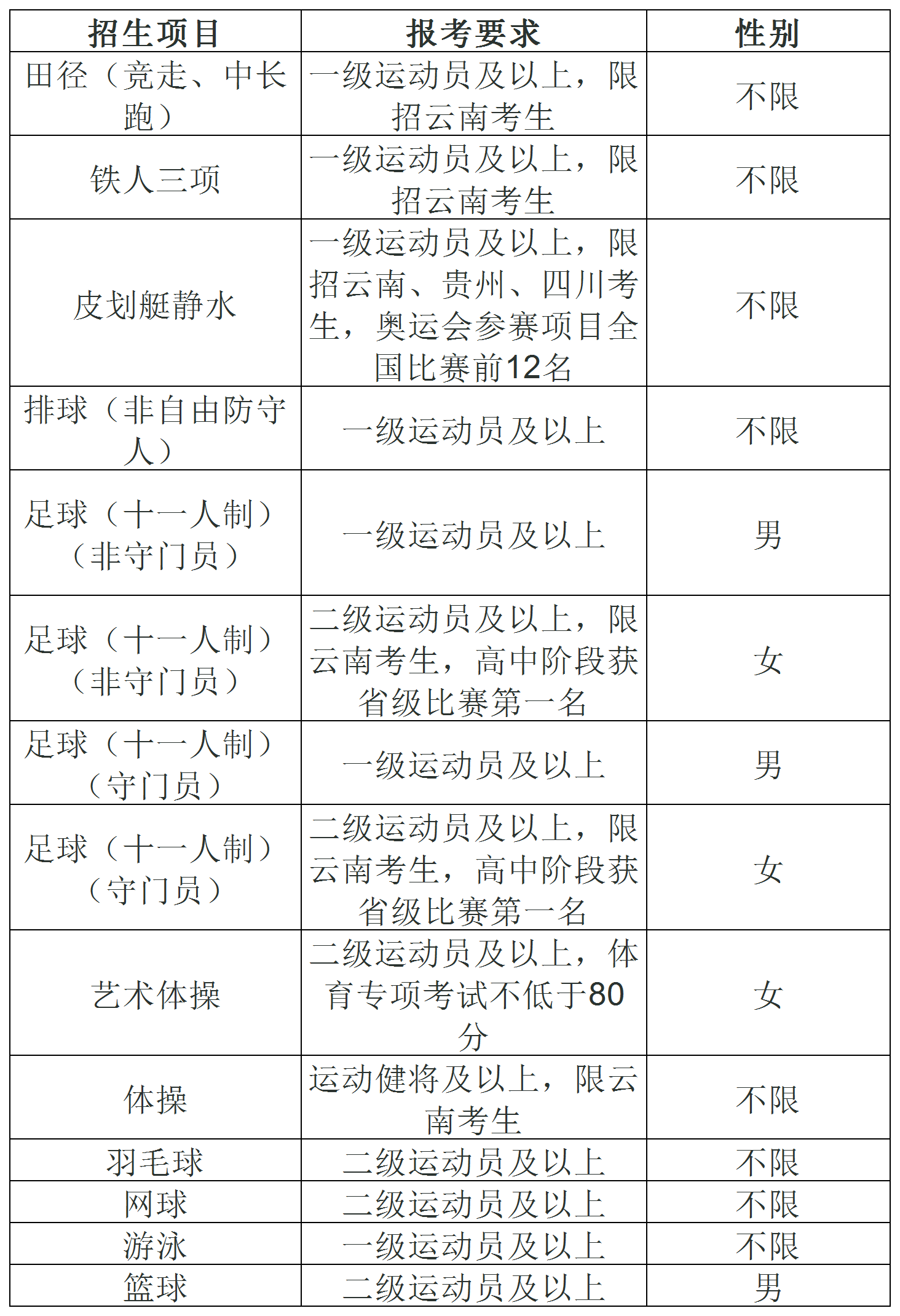 (二)我校面向全国各省、自治区、直辖市(不含港澳台)招收在役和退役的优秀运动员以及具备我校招生专业项目的国家二级运动员(含)以上技术等级称号的体育人才。具体项目等级要求见下表: