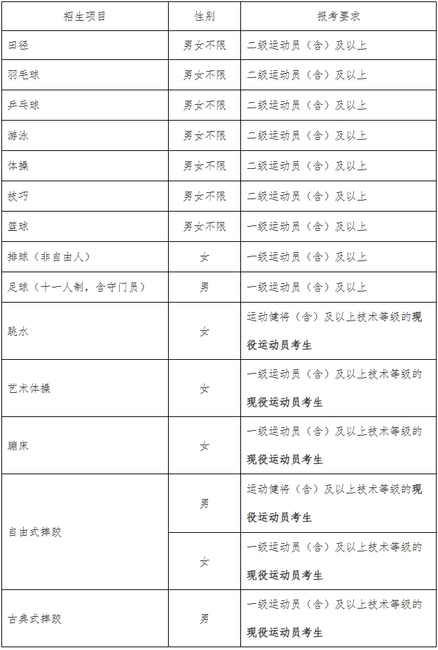 注:1.跳水、艺术体操、蹦床、自由式摔跤、古典式摔跤项目仅限广西壮族自治区专业队现役队员报考,非广西壮族自治区专业队现役队员不予录取。