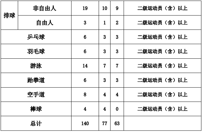 (三)上述拟招生计划中田径项目分田赛、径赛两类招生,不招全能,其中田赛不招男女链球小项,径赛不招男女竞走小项;足球分守门员与非守门员两类招生,排球项目分自由人与非自由人两类招生,其他招生项目均不分小项录取。