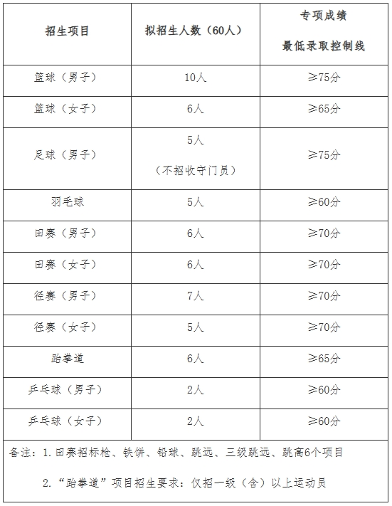 招生项目:篮球(五人制)、足球(十一人制)、羽毛球、田径、跆拳道、乒乓球。具体招生计划见下表: