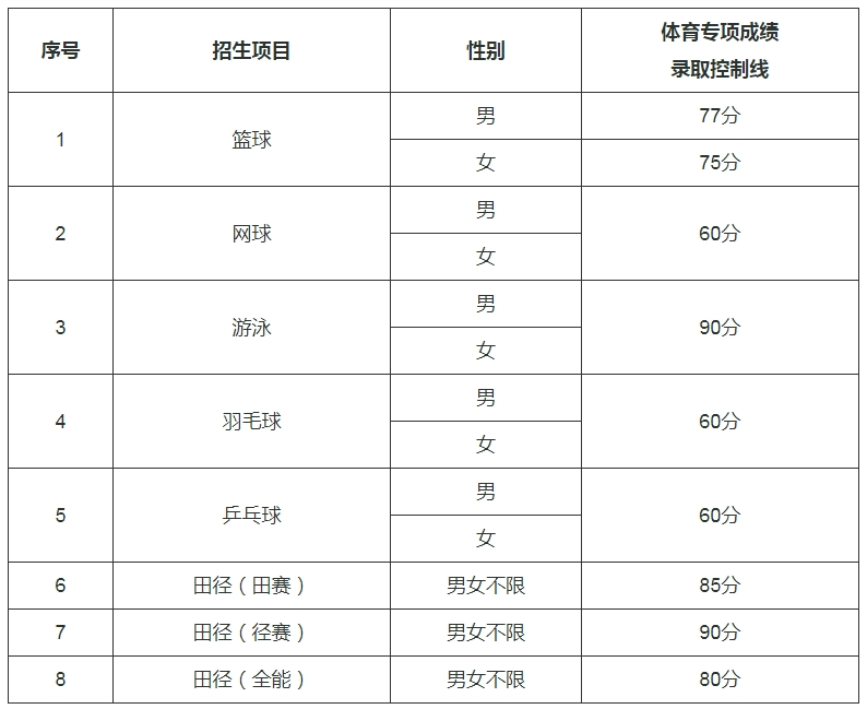 (二)体育专项成绩录取控制线