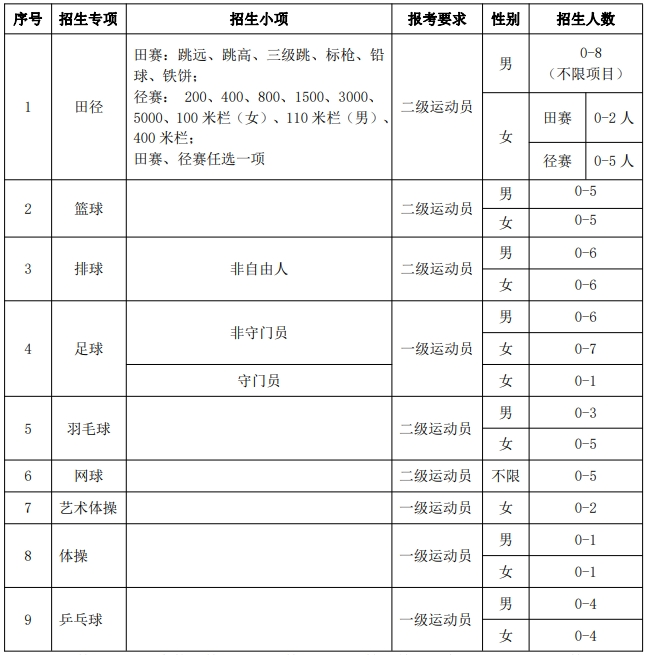 (二)足球、艺术体操、体操及乒乓球项目须具备一级运动员(含)以上运动技术等级称号,其余招生项目须具备国家二级运动员(含)以上运动技术等级称号。考生运动员技术等级以“国家体育总局运动员技术等级系统”公示的数据信息为准。考生如具备所报考项目的多个运动员技术等级证书,报名时需填报所有符合报名要求的运动员技术等级证书。等级证书审批日期为:2014年1月1日至2024年3月10日。