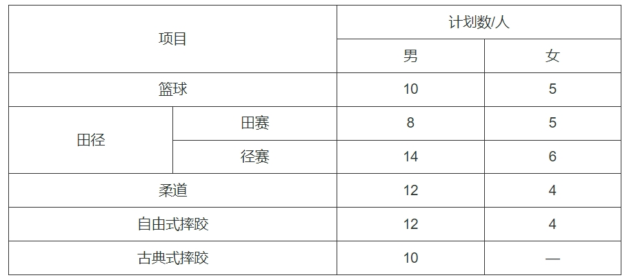 招生项目:篮球、田径、柔道、摔跤(自由式、古典式),分项目拟招生计划如下表所示(最终计划以上级主管部门批复的为准)。