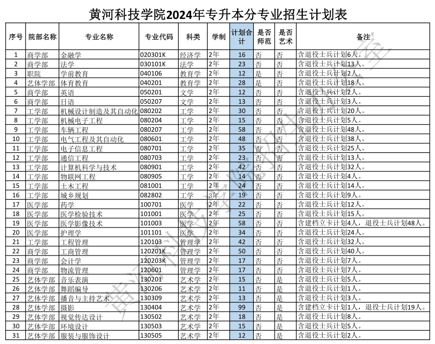 黄河科技学院2024年专升本招生计划