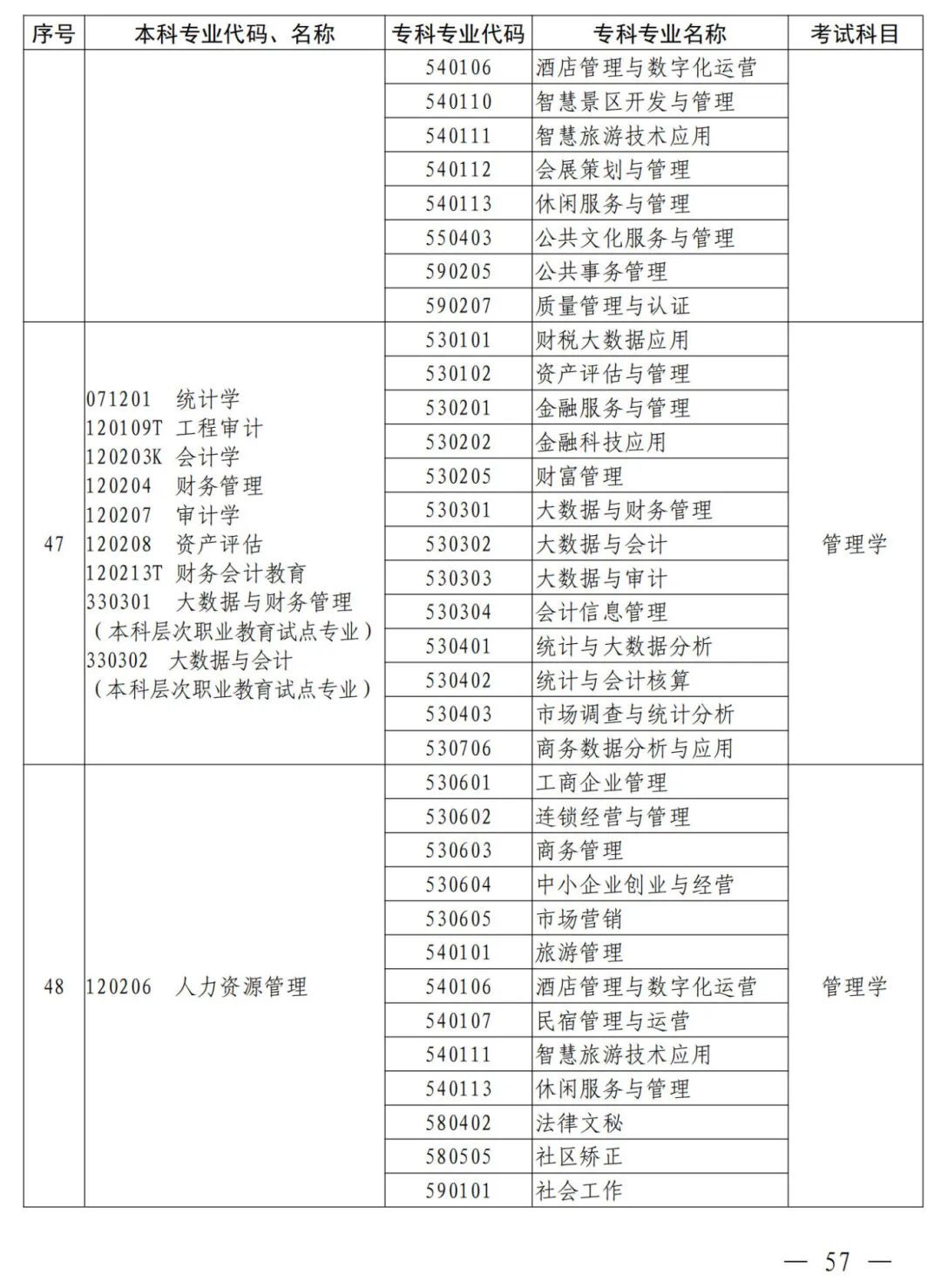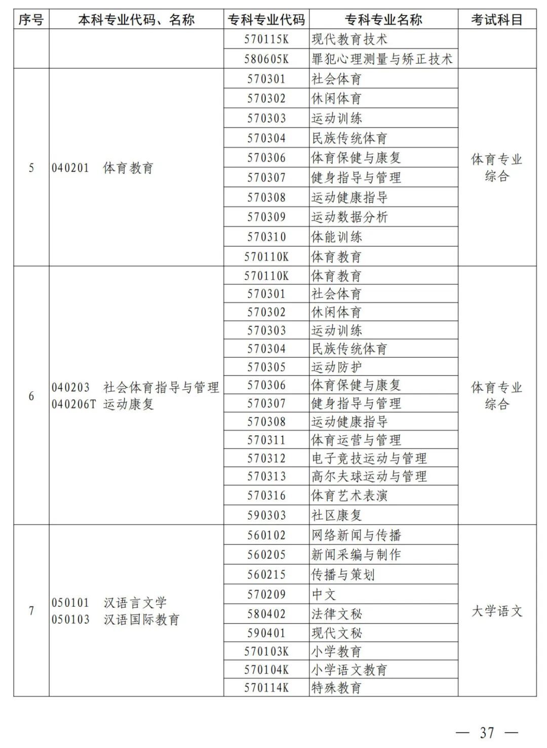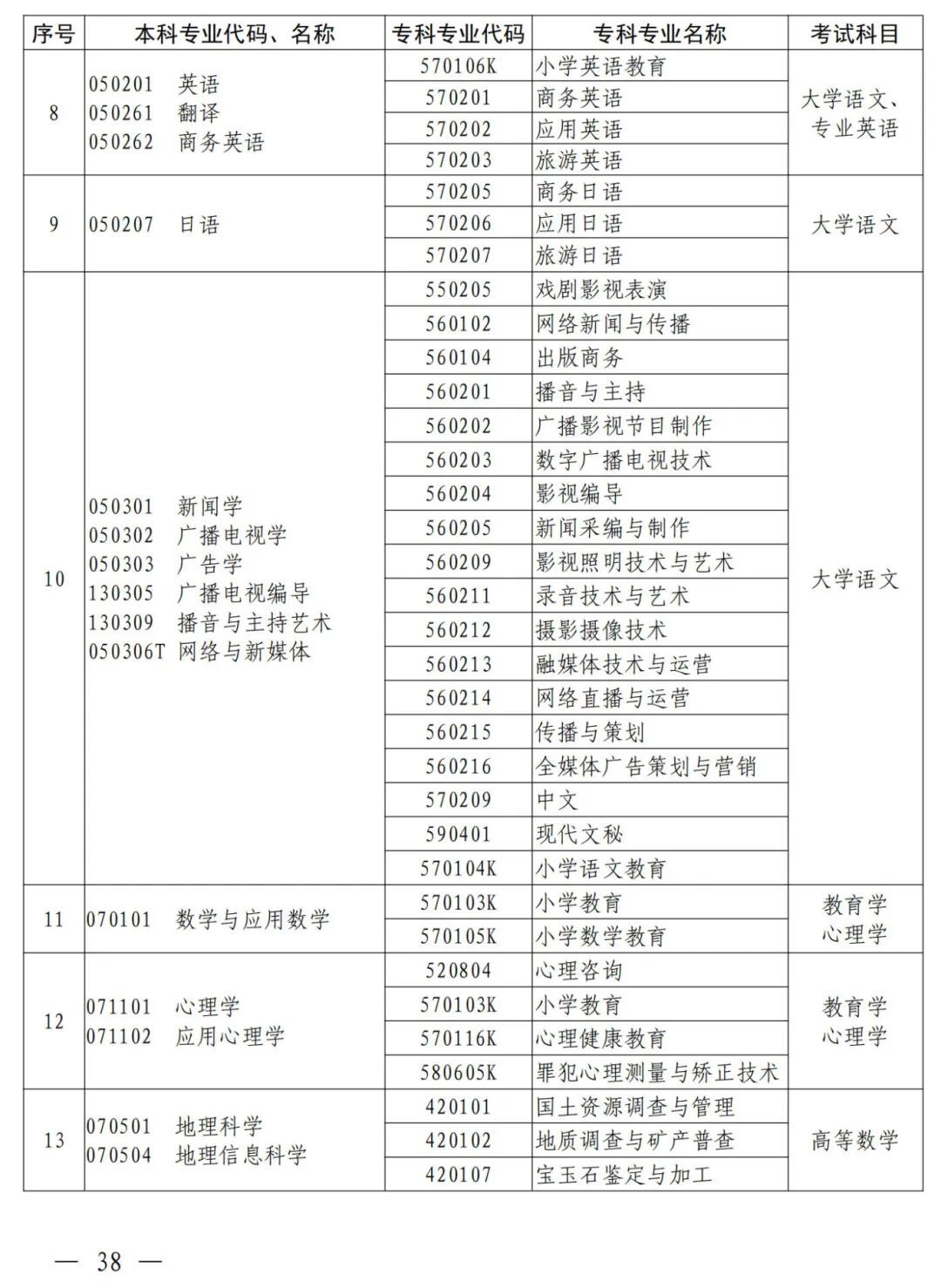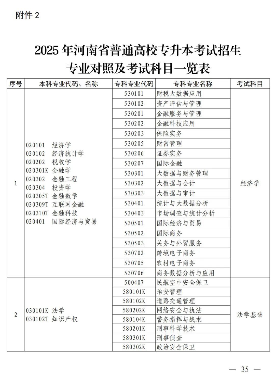 2025年河南省普通高校专升本考试招生专业对照及考试科目一览表