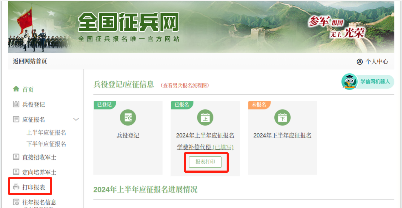 学费补偿(代偿)相关《申请表》均通过全国征兵网在线填写、打印。应征青年登录报名系统,点击页面“打印报表”,如图示: