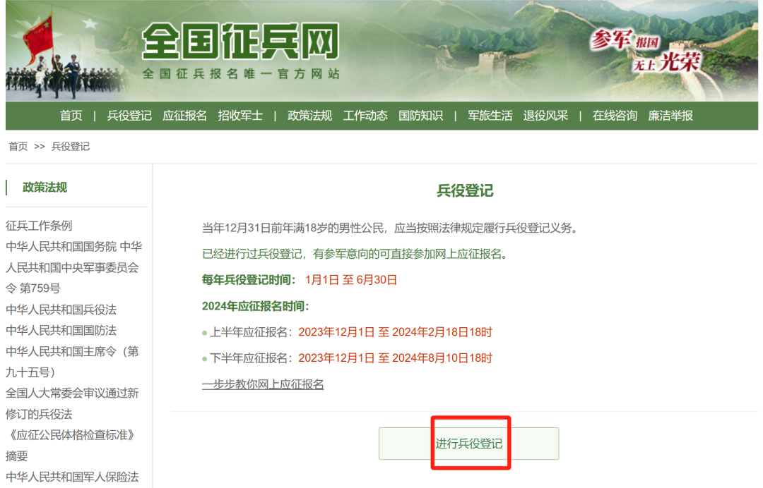 成功登录全国征兵网后,即可开始进行兵役登记。