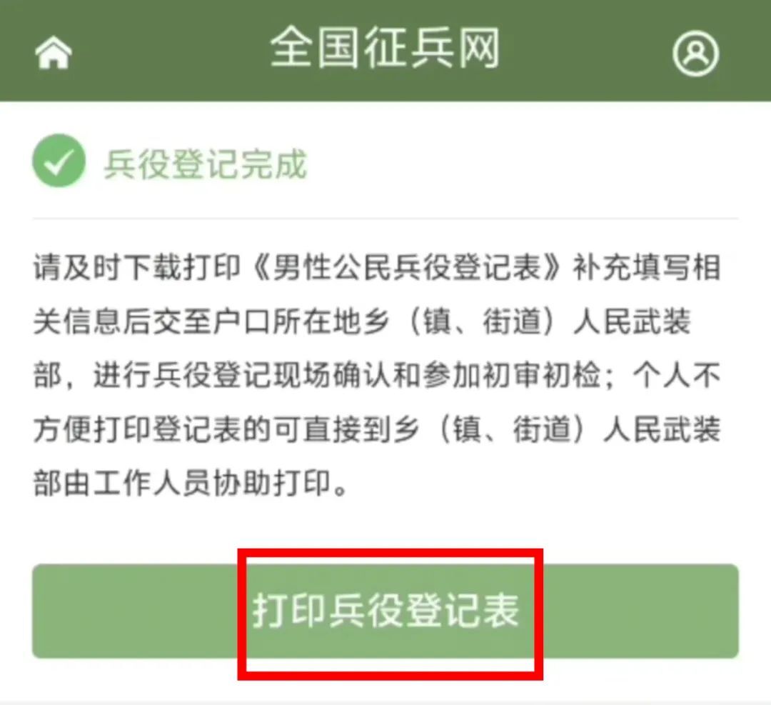 完成登记后,可以下载打印《男性公民兵役登记表》(普通高校新生在入学时需携带兵役登记相关证明)。