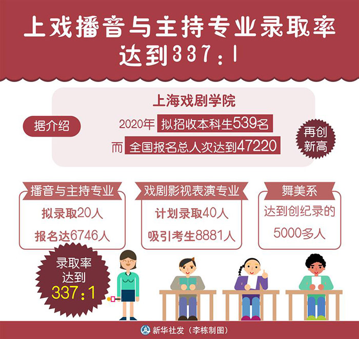 上戏招生办公室主任刘志新介绍说,今年“艺考”出现新现象。上戏播音与主持专业拟录取20人,报名达6746人,录取率达到337:1,力压戏剧影视表演专业成为年度最热门专业。而传统意义上的“造星”专业——戏剧影视表演专业计划录取40人,吸引考生8881人。