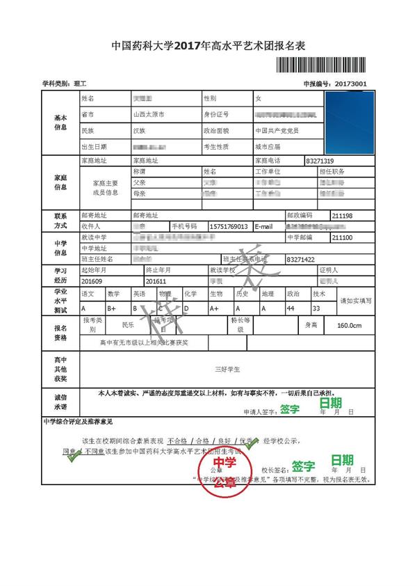 考生须在2017年2月24日前登录中国药科大学高水平艺术团报名系统(http://zb.cpu.edu.cn/enroll.do),认真阅读报名界面下方的填写说明,按照填写要求完成在线报名,请扫描上传报名表前,确保报名表内各项信息填写正确、完整且按要求加盖中学公章(详见附件:样表)。系统中要求提交的各项材料不需要邮寄,各项材料原件将在测试报到时审查,请考生妥善保管。
