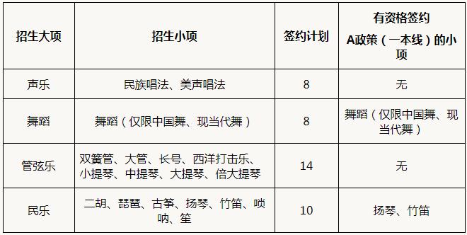 我校根据考生测试成绩排名、实际水平和高水平艺术团发展需要,确定签约名单并予以公示。签约政策分为以下两种: