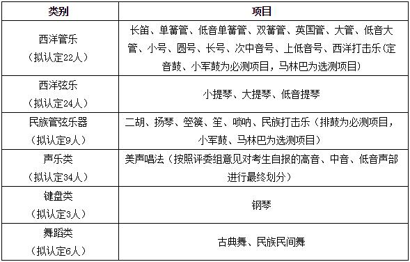 声乐类:能熟练视唱调性在3升3降以内(含3升3降)的五线谱,需具备2年以上参加合唱团的经历,或在省级(含)以上声乐或合唱比赛中获得优异成绩。