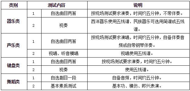 注:①我校可为考生提供低音提琴、定音鼓(23寸、26寸、29寸、32寸)、五音排鼓、钢琴,仅限考场内使用,其它乐器均需考生自备;②声乐、舞蹈使用音频要求为mp3或wav格式。
